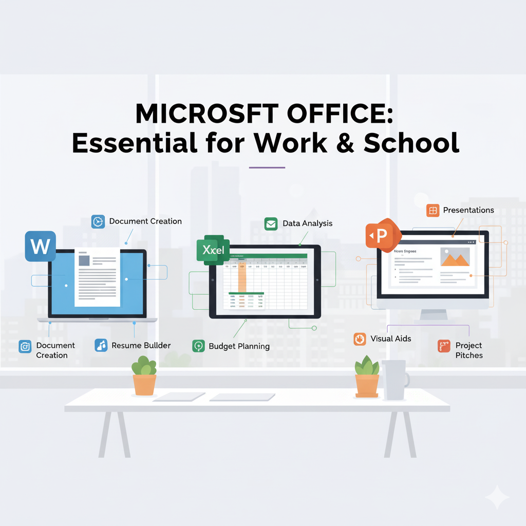 Master computer fundamentals, Windows, MS Office, Internet browsing, email, and online tools for work & study.