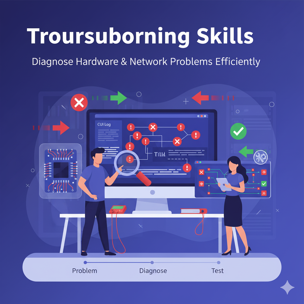 Learn hardware troubleshooting, networking concepts, LAN/WAN, routers, switches, and system maintenance from scratch.